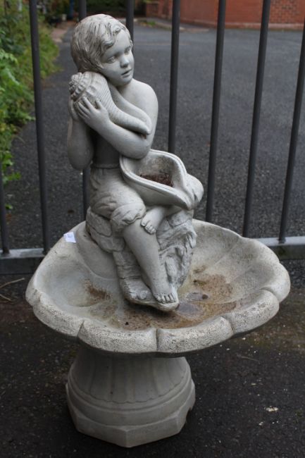A MODERN THREE PIECE FIGURATIVE SHELL BOWL OUTDOOR WATER FEATURE