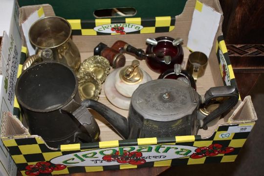 A SMALL TRAY OF VINTAGE METALWARE TO INCLUDE PIERCED DISHES, SILVER PLATED TEAPOT ETC.