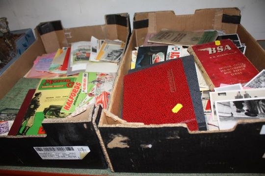 TWO TRAYS OF VINTAGE AND ANTIQUE EPHEMERA TO INCLUDE POSTCARDS, PHOTOGRAPHS, BSA MOTORCYCLE BOOK ETC