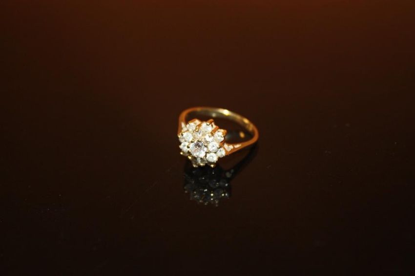 A LADIES 9 CARAT GOLD CZ CLUSTER RING - SIZE L - WEIGHT 2.6 GRAMS APPROX