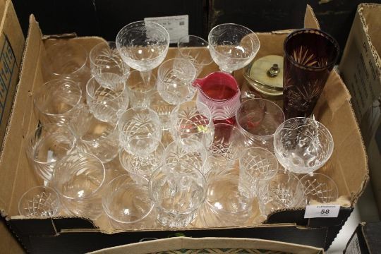 A SMALL BOX OF ASSORTED CUT GLASS ETC. TO INCLUDE A CRANBERRY CLASS STYLE JUG