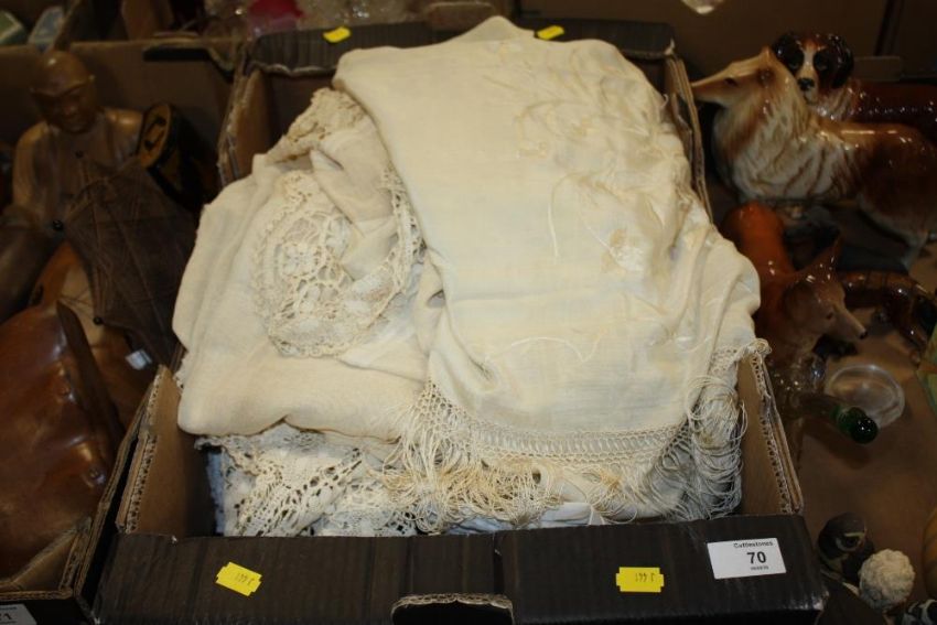 A TRAY OF VINTAGE TEXTILES, FURS ETC.