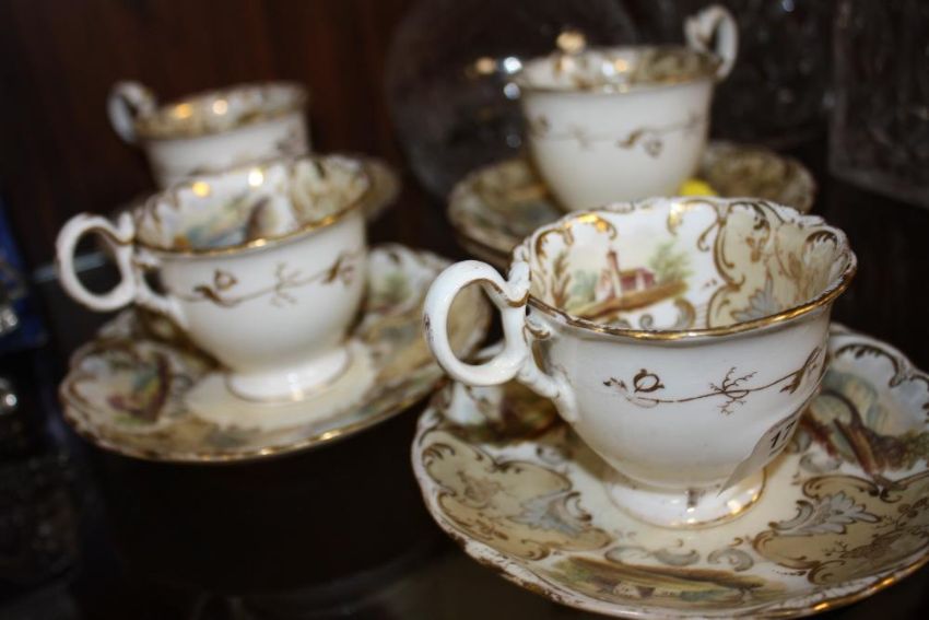 A SET OF FOUR ANTIQUE HAND PAINTED CUPS AND SAUCERS DECORATED WITH COUNTRY SCENES PLUS ONE ADDITIONAL SAUCER