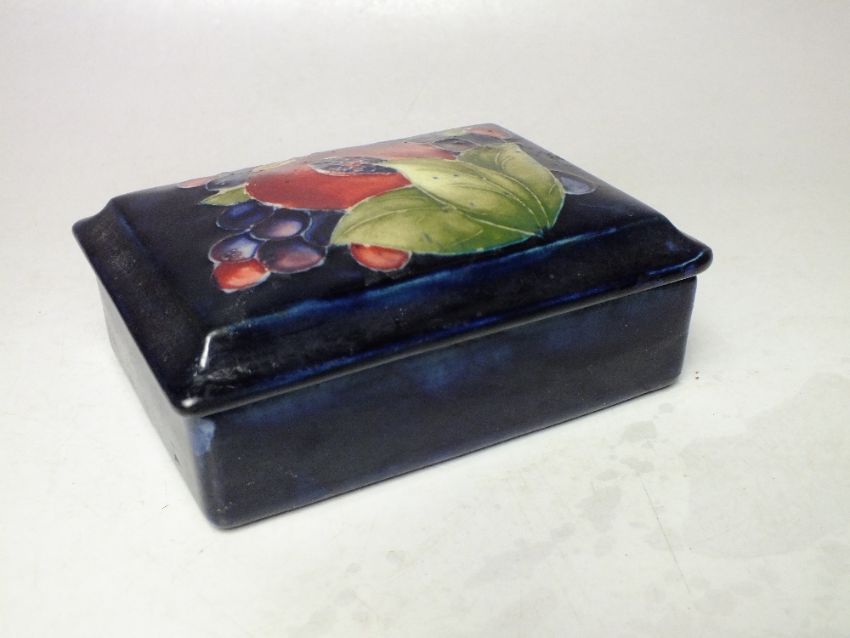 A MOORCROFT POMEGRANATE PATTERN RECTANGULAR LIDDED BOX, with typical tubelined decoration, paper label and impressed marks to base, impressed signature and marks to underside of lid, W 12, D 9, H 5 cm