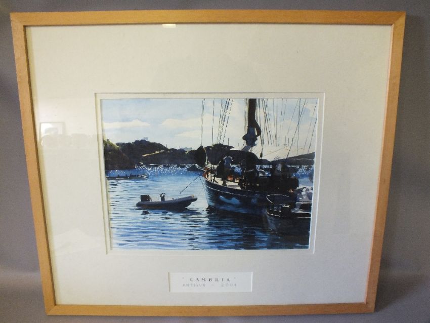 IAN MAGINNIS (XXI). Caribbean harbour scene with boats and figures 'Cambria & Tender Antigua 2004' see verso, signed lower right, watercolour, framed and glazed, 29 x 39 cm