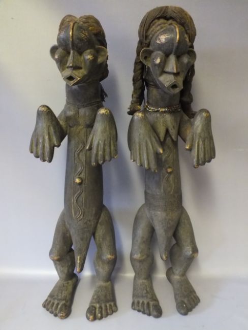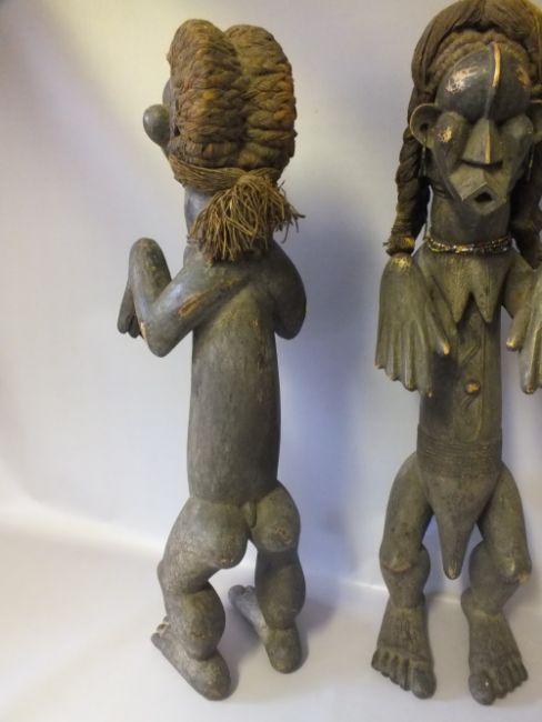 A PAIR OF WEST AFRICAN CARVED TRIBAL FIGURES, depicting a man and woman in traditional dress, H 62 cm (2)