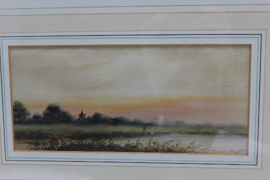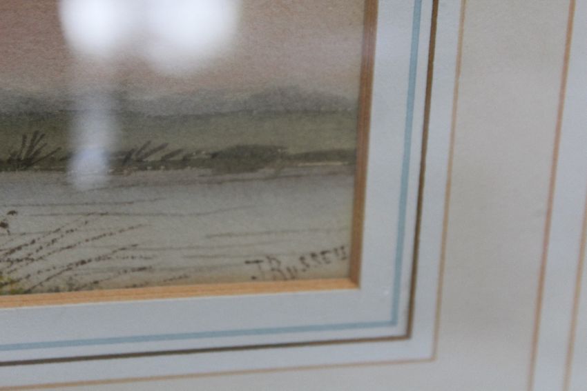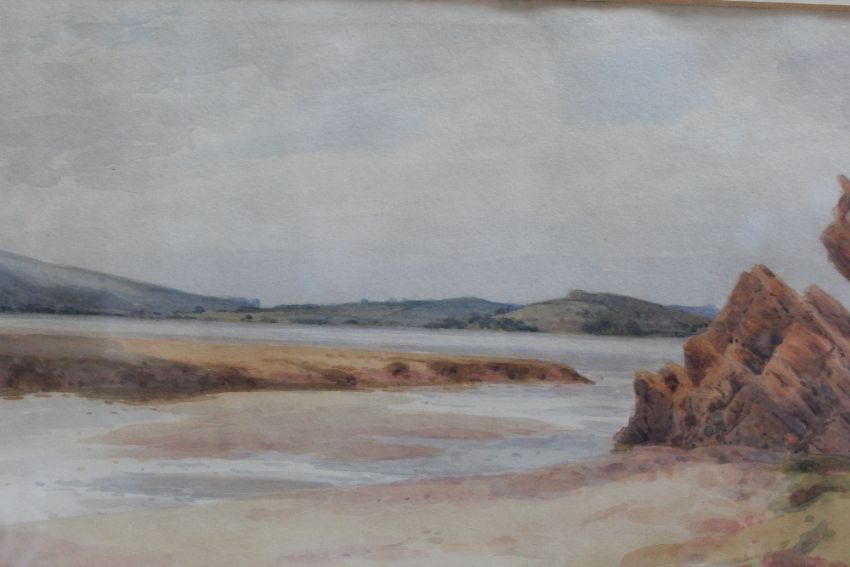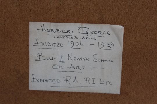 HERBERT GEORGE (Exh. 1906-1939). A rocky coastal scene, unsigned, label verso, 'BUSHY & NEWLYN SCHOOL OF ART EXHIBITED R.A.RI ETC', watercolour, framed and glazed, together with J RUSSELL, a river landscape, signed bottom right, watercolour, framed and glazed (2)