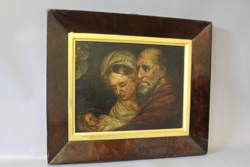 (XVII-XVIII). Study of a bearded man with wife & child, unsigned, oil on board, framed, 24 x 31 cm