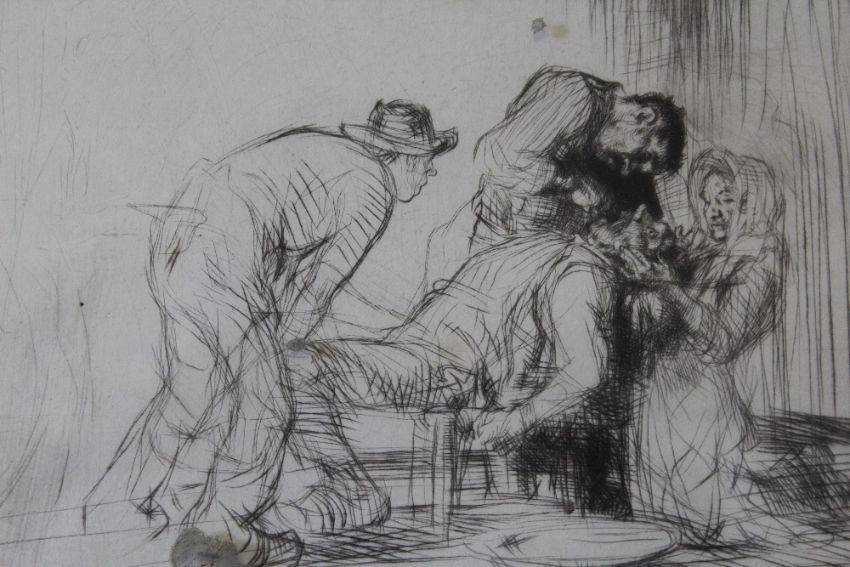 EDMUND BLAMPIED (1886-1966). Channel Island artist, 'Figures at the Dentist with an Unfortunate Man Having an Extraction', signed in pencil lower middle, etching on paper, framed and glazed, 19 x 26 cm