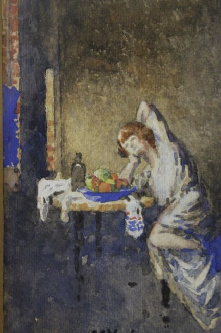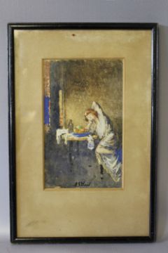 A.S. WOOD (XX). British school, interior scene with young women at a table with wine & fruit, signed lower middle, watercolour on paper, framed & glazed, 18 x 11 cm