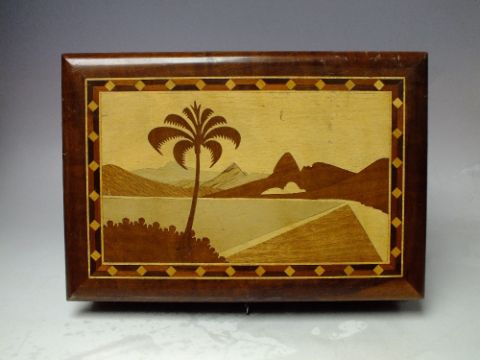A 20TH CENTURY SORRENTO WARE SEWING BOX, the hinged rectangular lid inlaid to depict mountainous landscape with palm tree, W 31.5, D 21.5, H 9.5 cm