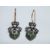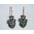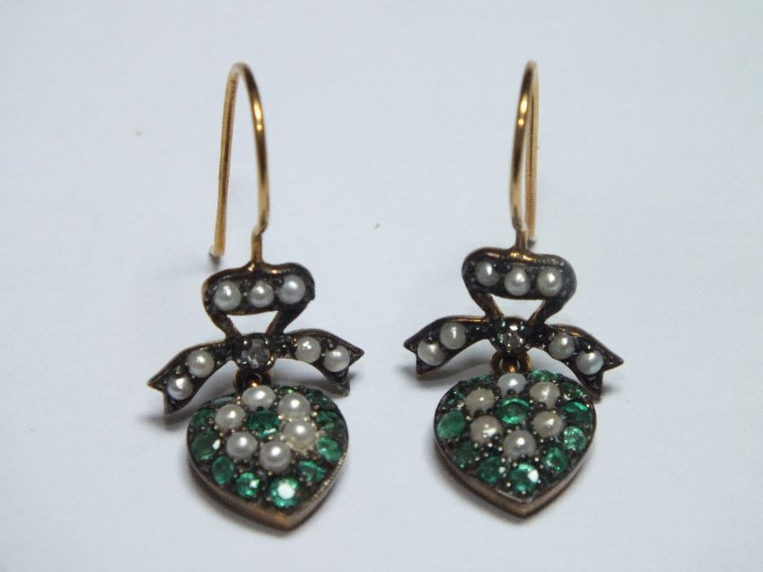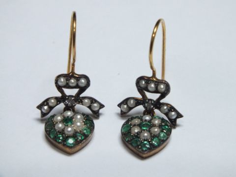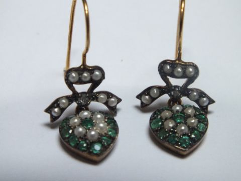 A PAIR OF HEART AND BOW EARRINGS, set with green stones and seed pearls, H 3.25 cm