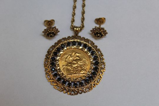 AN ELABORATELY MOUNTED FULL SOVEREIGN 1907 PENDANT WITH ACCOMPANYING EARRINGS, in a pierced mount surrounded by sapphires, approx combined weight 25.7g, pendant width 4 cm