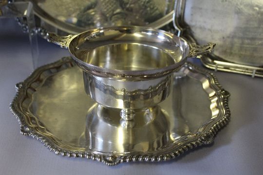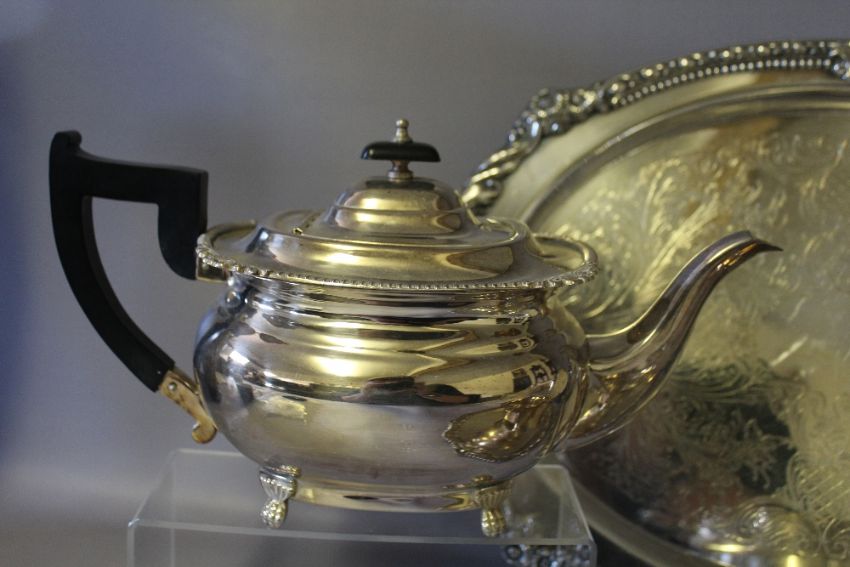 FIVE PIECES OF SILVER PLATED WARE, consisting of a teapot, trays and a champagne coaster, widest tray 53 cm