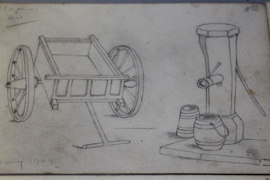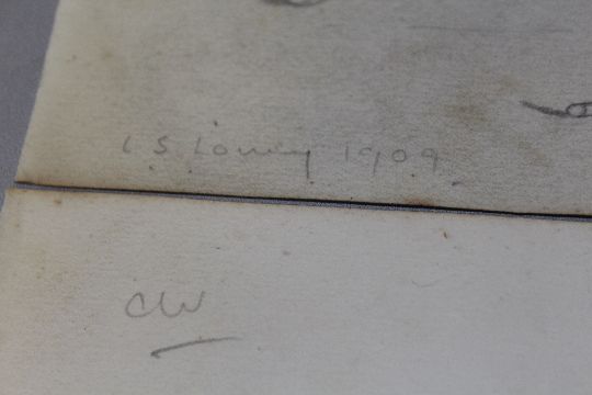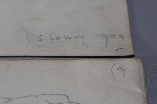 CIRCLE OF LAURENCE STEPHEN LOWRY (1887-1976). Four sketches, various subjects, three bearing signatures and date 1909 lower right and one bearing signature and date 1909 lower left, pencils on paper, unframed, 14 x 23 cm