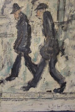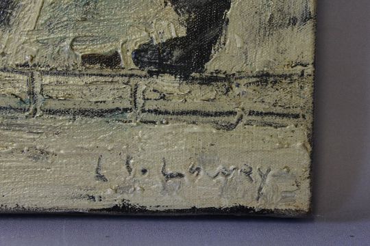 CIRCLE OF LAURENCE STEPHEN LOWRY (1887-1976). Street scene with two figures and a cat, bears signature lower right, oil on canvas, unframed, 30 x 25 cm
