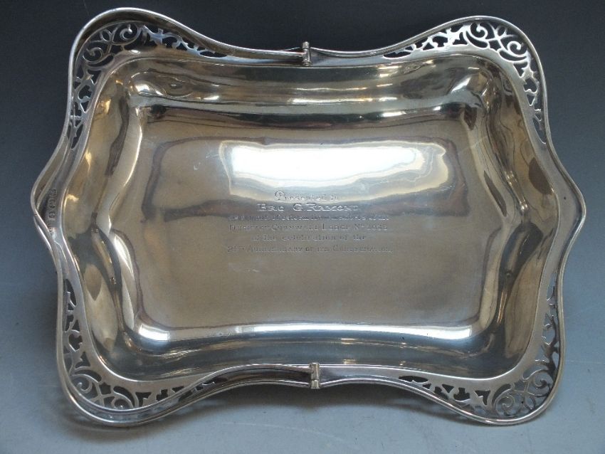 MASONIC INTEREST - A HALLMARKED SILVER SWING HANDLED BASKET - BIRMINGHAM 1922, with engraved dedication to interior 'Presented to BRO. G. RAMONE as a mark of esteem from the members of the Duchy of Cornwall Lodge No. 3036 at the celebration of th 21st Anniversary of its Consecration', W 26 cm