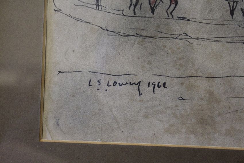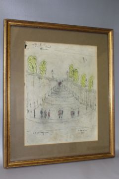 CIRCLE OF LAURENCE STEPHEN LOWRY (1887-1976). A scene in Salford with figures before steps, bears signature and date 1961 lower left, pen, ink and wash on paper, framed and glazed, 33 x 26 cm