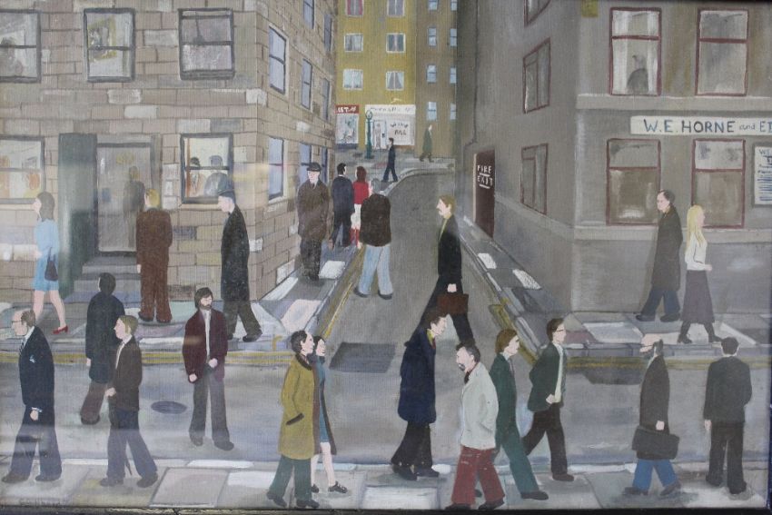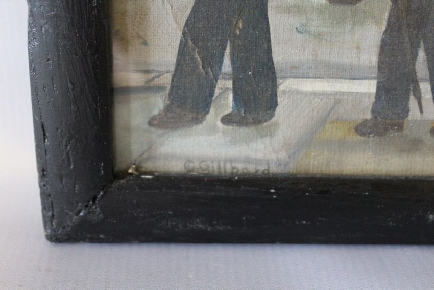 CRISPIN GILLBARD (XX). A street scene with numerous figures, signed lower left, oil on canvas on board, framed and glazed, 36 x 56 cm