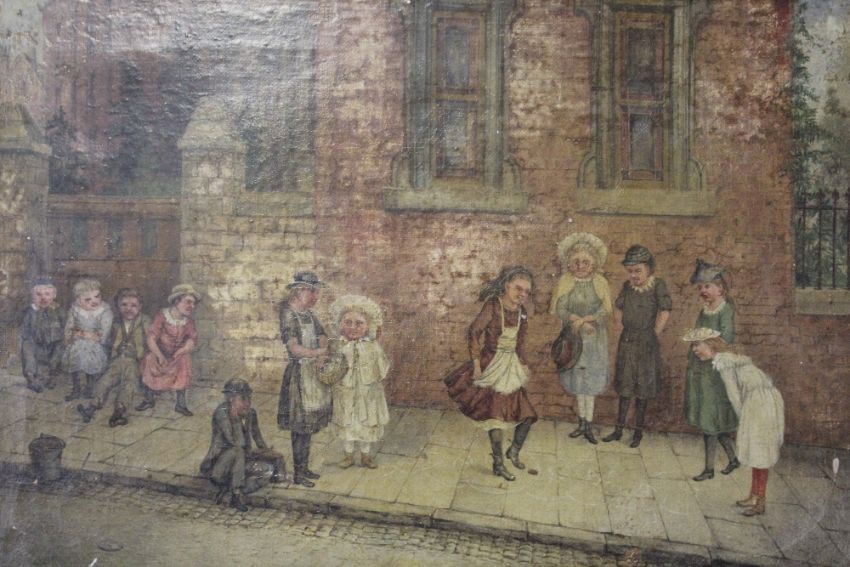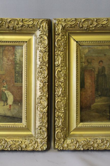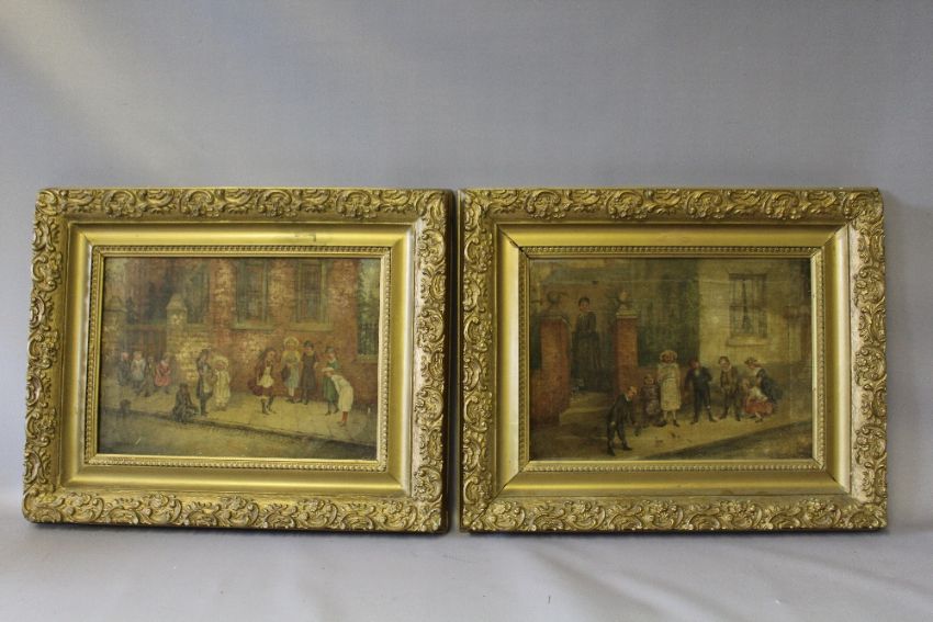 (XIX). English school, a pair of street scenes with lady, dog and children before buildings, unsigned, oils on canvas, framed, 24 x 33 cm
