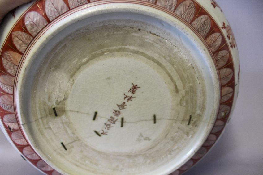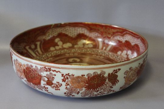 A LARGE JAPANESE KATANI BOWL, decorated in red and gold, with a floral pattern to the outside, to the interior a central dog of fu, seven character mark to the base, H 9 cm, Dia. 31 cm A/F