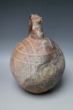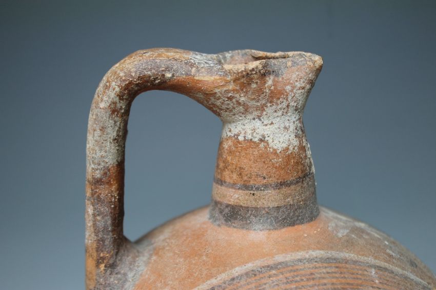 A CYPRIOT BLACK ON RED WARE TERRACOTTA JUG - CYPRO-ARCHAIC - CIRCA 750-600 BC, the globular body decorated with black painted concentric circles and bands, with ribbed loop handle, H 30 cm