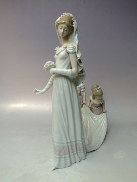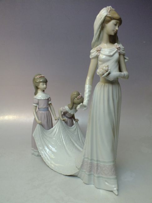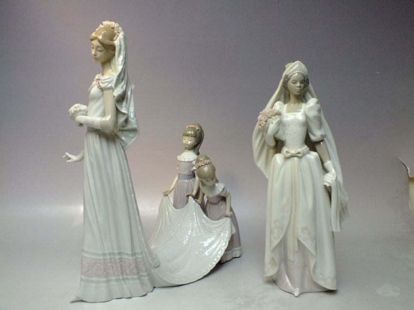 A LLADRO WEDDING GROUP FIGURE OF A BRIDE AND BRIDESMAIDS, H 34.5 cm, together with a Lladro figure of a bride (2)