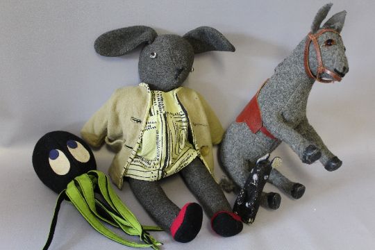A COLLECTION OF VINTAGE AND MODERN TEDDY BEARS ETC, to include a vintage monkey hand puppet, a Farnell lamb A/F, a felt horse and rabbit etc. (12)