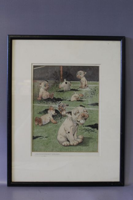 GEORGE ERNEST STUDDY (1878-1948). Bonzo dog study 'Hard Lines on the Tennis Courts', see verso, unsigned, watercolour, framed & glazed, 24 x 18 cm
