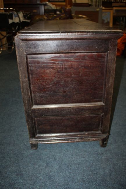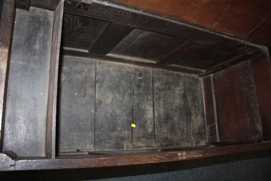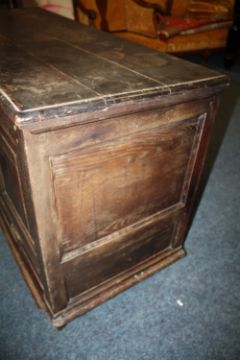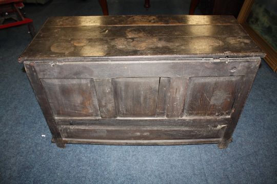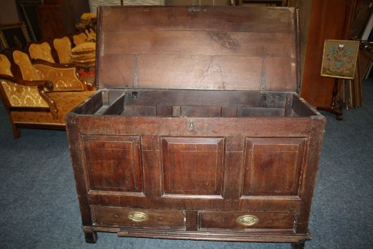 AN ANTIQUE OAK PANELLED MULE CHEST, the original hinged lid above a tripe panel front and two drawers below, H 77 cm, W 124 cm S/D