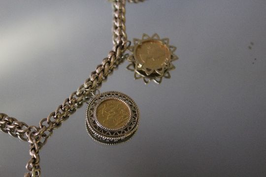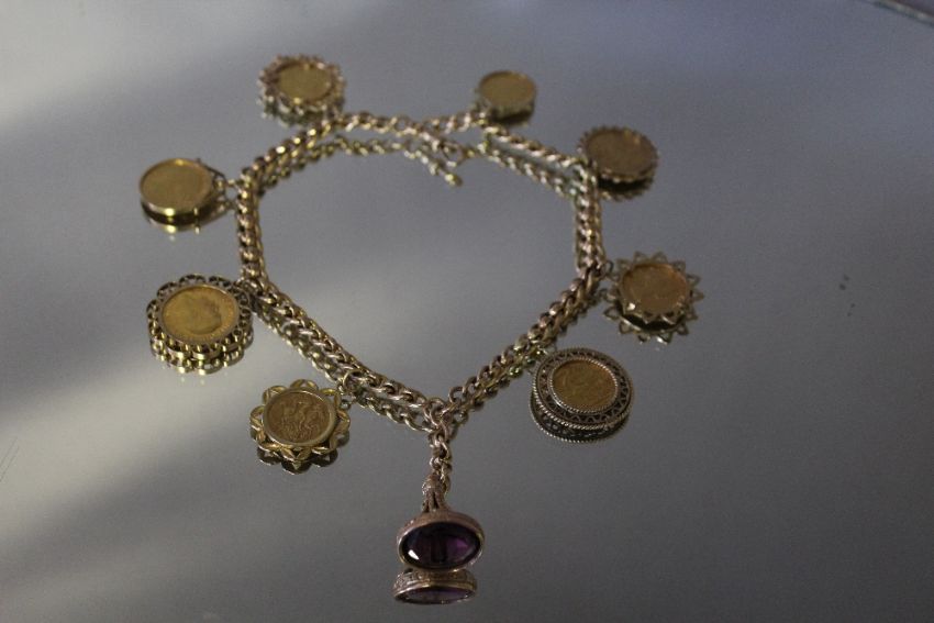 A 9CT GOLD ROLLER CHAIN SET WITH AN ORNATE AMETHYST SEAL AND EIGHT ASSORTED GOLD COINS, comprising four full sovereigns and four half sovereigns to include a shield back example, approx weight 121g