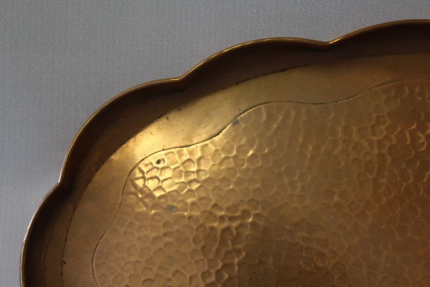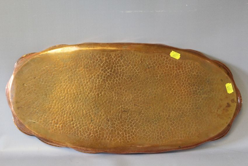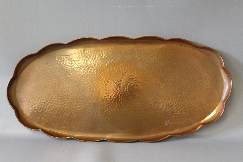NEWLYN. Oval copper tray with scalloped edges, stamped verso, 27 x 58 cm