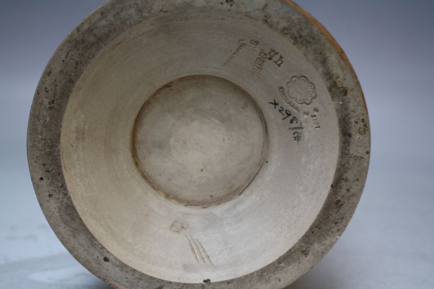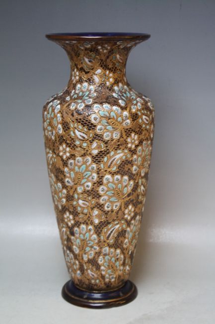 A TALL DOULTON LAMBETH SLATERS PATENT DECORATIVE STONEWARE VASE, of baluster form with flared rim, enamel floral and textured decoration on natural ground, impressed marks to base, H 41 cm
