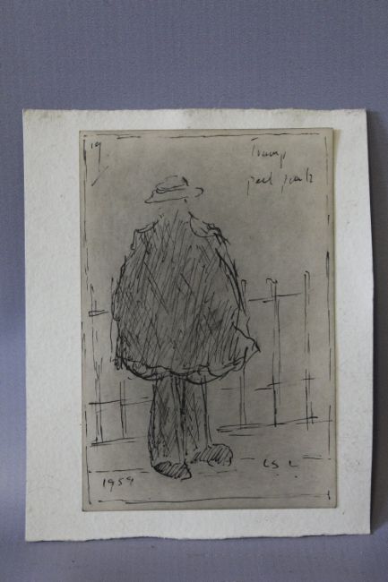 CIRCLE OF LAURENCE STEPHEN LOWRY (1887-1976). Study of a tramp by railings, inscribed, bears initials lower right and date 1959 lower left, pen and ink on paper, unframed, 15 x 10 cm