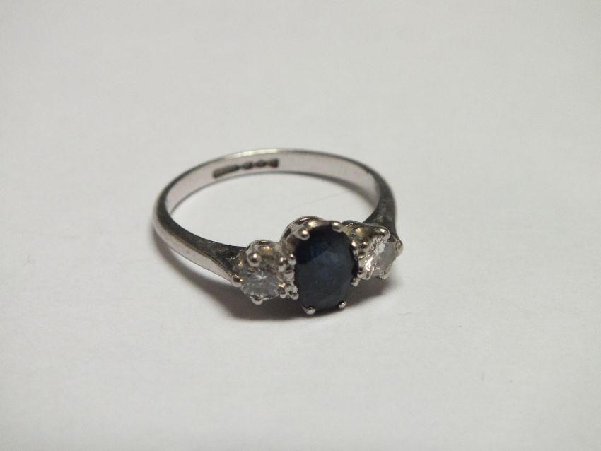 A SAPPHIRE AND DIAMOND THREE STONE RING, the brilliant cut diamonds being an estimated 10pts each, ring size O