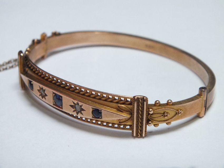 A HALLMARKED 9CT GOLD EDWARDIAN GEM SET HINGED BANGLE, approx weight 11.3 g