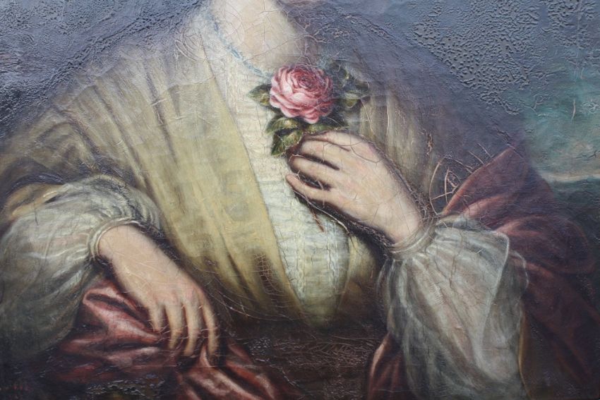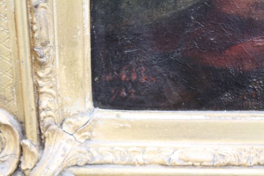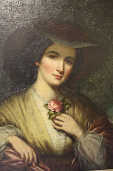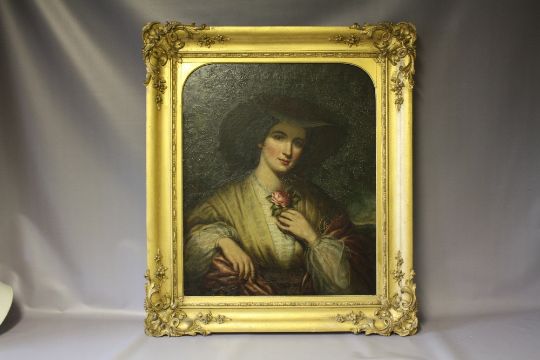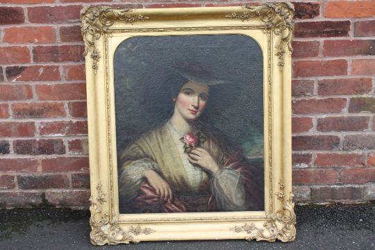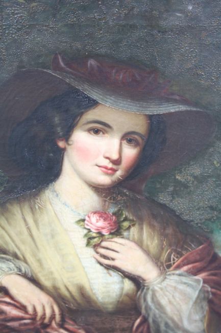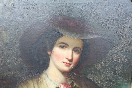ENGLISH SCHOOL (XIX) Portrait of a lady wearing a hat with a country landscape behind, bearing signature and date lower left but indistinct, oil on canvas, gilt framed, 75 x 63 cm A/F
