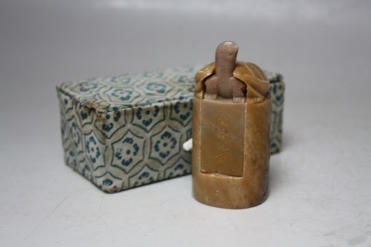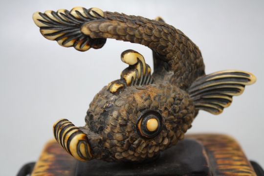 AN UNUSUAL CARVED 19TH CENTURY PUFFA STYLE FISH HELD ON A RECTANGULAR MOUNT, formerly a bag fastener, overall H 8.5 cm, together with a hardstone seal (2)