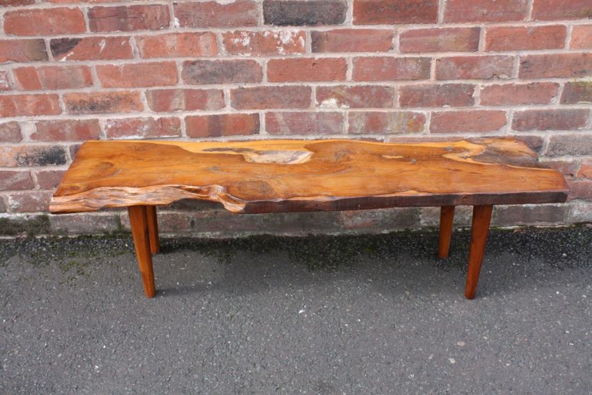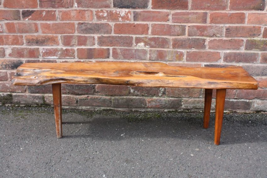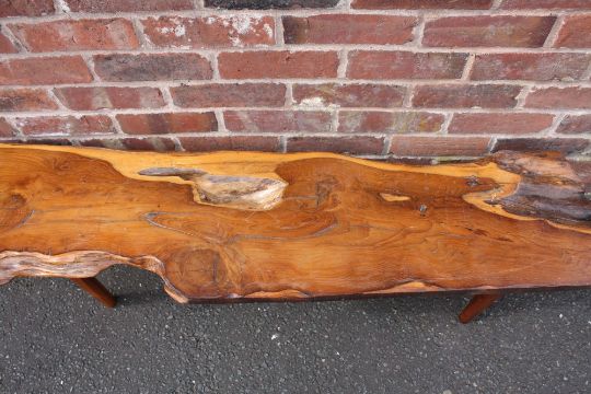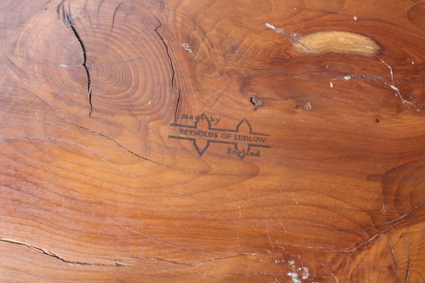 A MID 20TH CENTURY YEW WOOD COFFEE TABLE BY REYNOLDS OF LUDLOW, the shaped top raised on four circular supports, stamped to the reverse, H 40 cm, L 138 cm