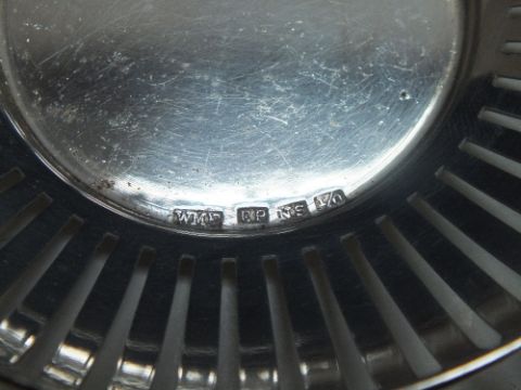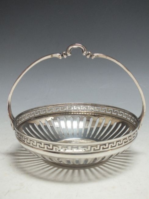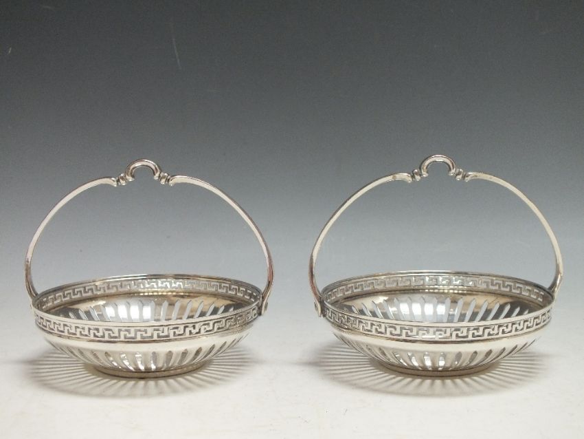 A PAIR OF WMF CIRCULAR SILVER PLATED BASKETS, with openwork and Greek key design border, basket Dia 10 cm, H 9 cm to inc carry handle (2)