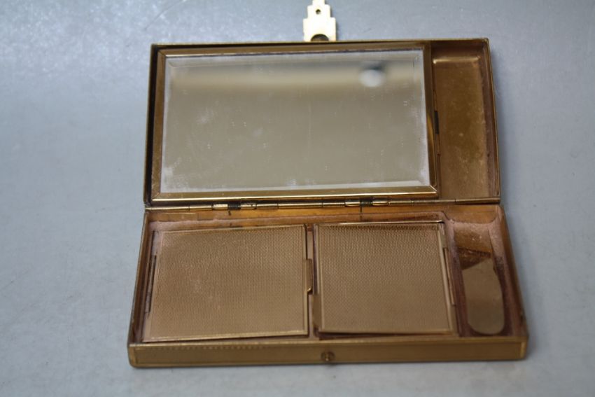 A MINIATURE FLASH CUT GLASS PERFUME BOTTLE WITH GILT FITTINGS, H 5.5 cm, together with an Art Deco style yellow metal ladies combination powder compact (2)