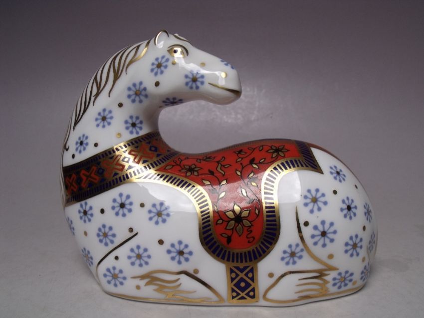 A ROYAL CROWN DERBY HORSE PAPERWEIGHT, gold stopper, with box, W 13 cm