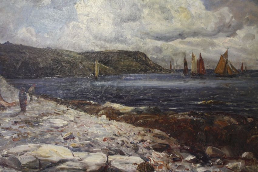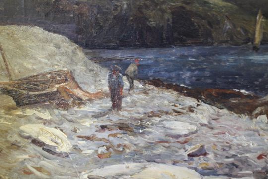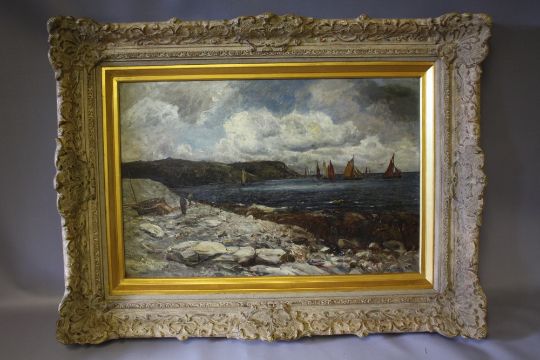 GUSTAVE DE BREANSKI (1856-1898). Stormy rocky coastal scene with figures and sailing vessels, signed lower left, oil on canvas, framed, 39 x 60 cm