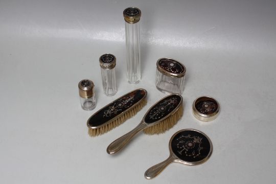 A MATCHED HALLMARKED SILVER AND PIQUE WORK VANITY / DRESSING TABLE SET - MOSTLY BIRMINGHAM 1913, comprising hand mirror, two brushes, three lidded vanity jars, a perfume bottle and a pill box (8)