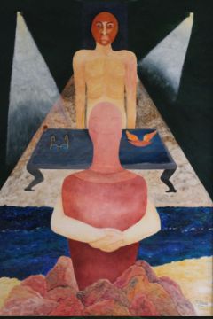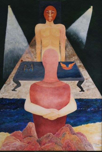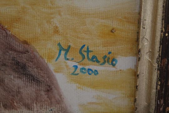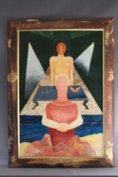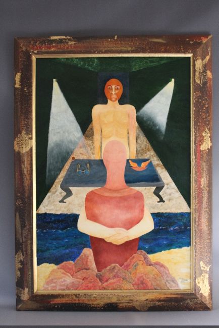 MAZIO STASIO. Continental school, surreal shore scene with figures, 'IL SAGNO', see label verso, signed and dated 2000 lower right, oil on canvas, framed, 88 x 58 cm