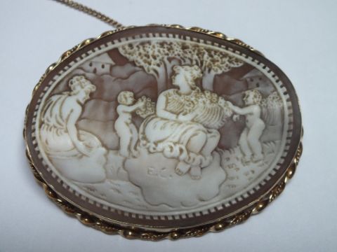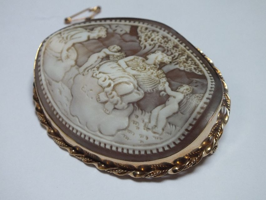 A LARGE HALLMARKED 9 CT GOLD CAMEO BROOCH, W 6.5 cm