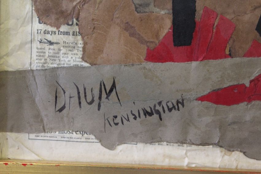 P. Mc?; A modernist composition with seated female nude, signed lower right, mixed media collage on paper laid on board, framed and glazed, 59 x 44 cm