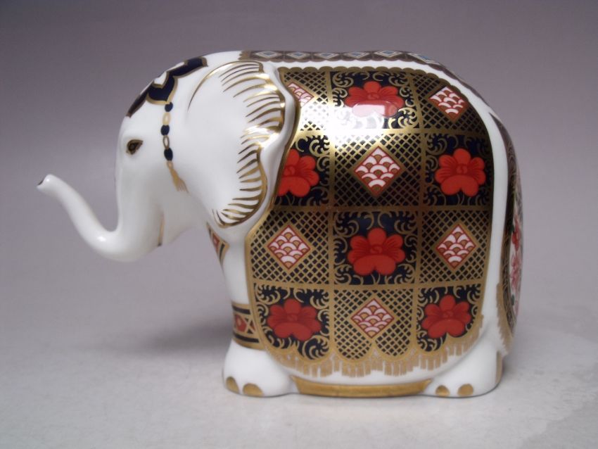 A ROYAL CROWN DERBY IMARI ELEPHANT PAPERWEIGHT, silver stopper, with box, L 15 cm