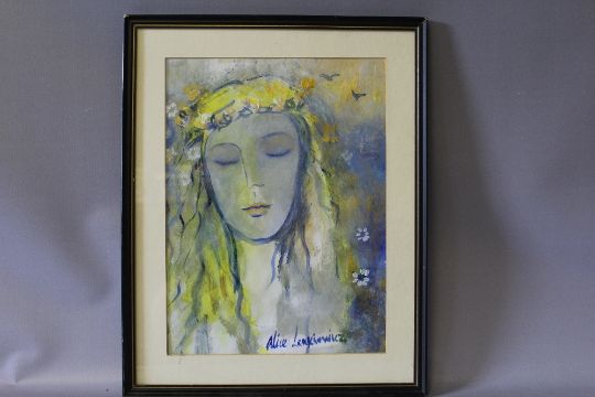 ALICE LENKIEWICZ (XX). Portrait study of a young woman with a garland of flowers in her hair, signed lower middle, mixed media on paper, framed and glazed, 34 x 25 cm