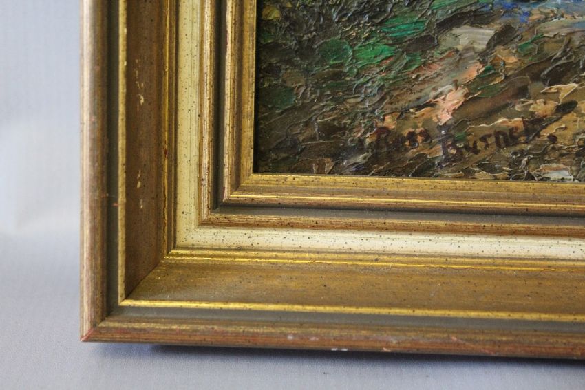 CECIL ROSS BURNETT (1872-1933). Rural wooded landscape with horse, ridge and dog about to cross a ford, see label verso, singed lower left, oil on canvas laid on panel, framed, 46 x 31 cm